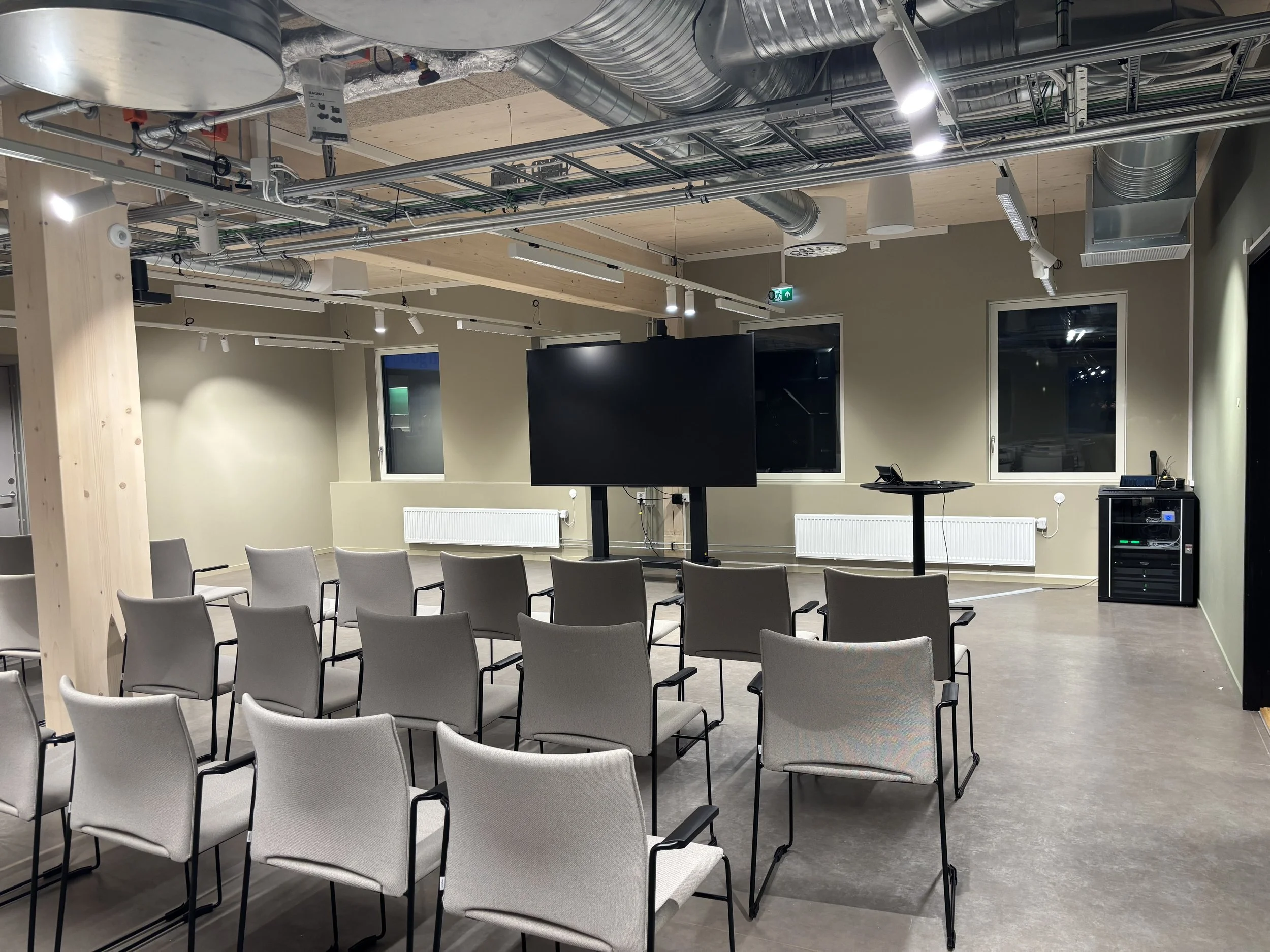 Salen er utstyrt med eit solid lydanlegg, mikrofonar og myggar som sikrar klar og tydeleg formidling. I tillegg har han eit komplett videooppsett som gjer det mogleg å strømme konferansar og andre arrangement direkte, eller ta opp innhald for seinare bruk.
